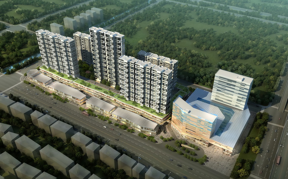 The total site area is 59280㎡(88.9 mu). Overall building area is 192820㎡ including 148200㎡overground area and 44620㎡underground area.For the whole project, the building density is 40.20%; the greening ratio is 20% and the plot ratio is 2.5. For residential building part, the building density is 30%; the greening ratio is 30% and the highest building is of 94.1m height.