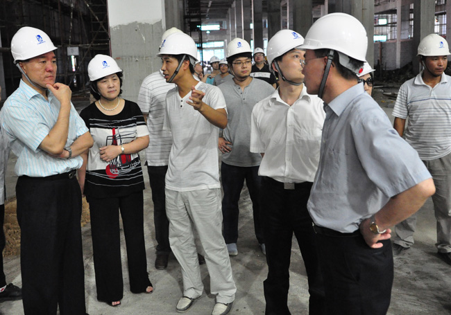 一到現(xiàn)場,展現(xiàn)在眼前的宏偉壯觀的景象令每一個人震撼:整個廠房長800米寬200米,近800個工人們頂著烈日熱火朝天地忙碌著。嚴(yán)總一行首先察看了在建中的鮮奶車間工地,仔細詢問了人員工作情況、現(xiàn)場安全管理情況和施工進度。該項目作為上海市重點項目和國家級重大項目,體量大、工期緊,業(yè)主要求也非常嚴(yán)格,項目團隊?wèi){借高度的責(zé)任感,運用自己的智慧與經(jīng)驗,克服各種困難,使項目有序地推進。在現(xiàn)場,大家對管理的井然、梁柱的挺括不時發(fā)出嘖嘖稱贊。