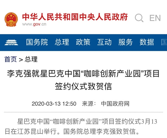 2020年3月13日,星巴克中國(guó)“咖啡創(chuàng)新產(chǎn)業(yè)園”項(xiàng)目簽約儀式在江蘇昆山舉行。國(guó)務(wù)院總理李克強(qiáng)致賀信。