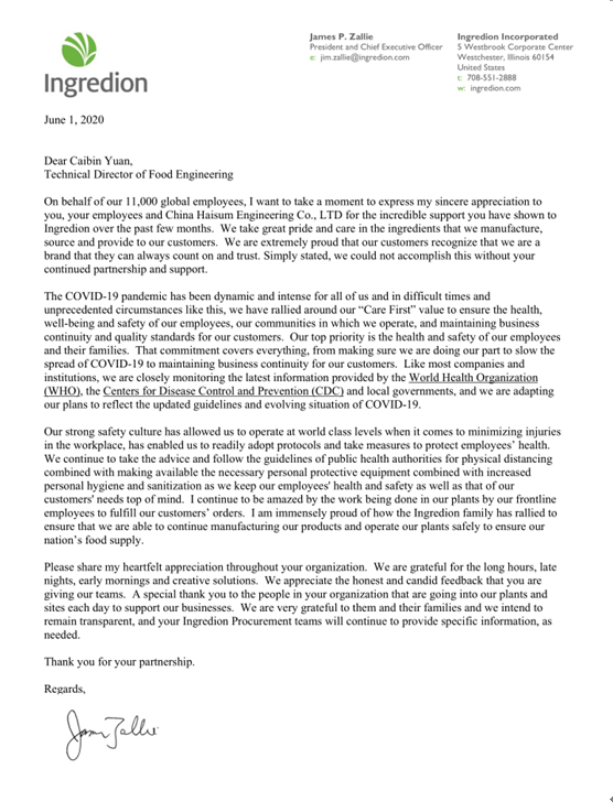 日前,海誠(chéng)股份食品總監(jiān)袁蔡斌收到一封來(lái)自美國(guó)宜瑞安集團(tuán)(Inredion Incorporated)首席執(zhí)行官詹姆斯•扎利(James Zallie)先生的感謝信,信中對(duì)公司的宜瑞安五星項(xiàng)目設(shè)計(jì)團(tuán)隊(duì)以及項(xiàng)目經(jīng)理黃萍,在新冠疫情期間為項(xiàng)目順利進(jìn)行所付出的辛勤工作表示感謝。