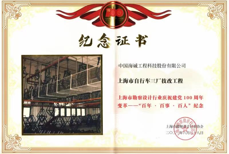 日前,公司在上海市勘察設(shè)計行業(yè)協(xié)會慶祝建黨100周年活動中榮獲“百年·百事·百人活動”紀念獎。