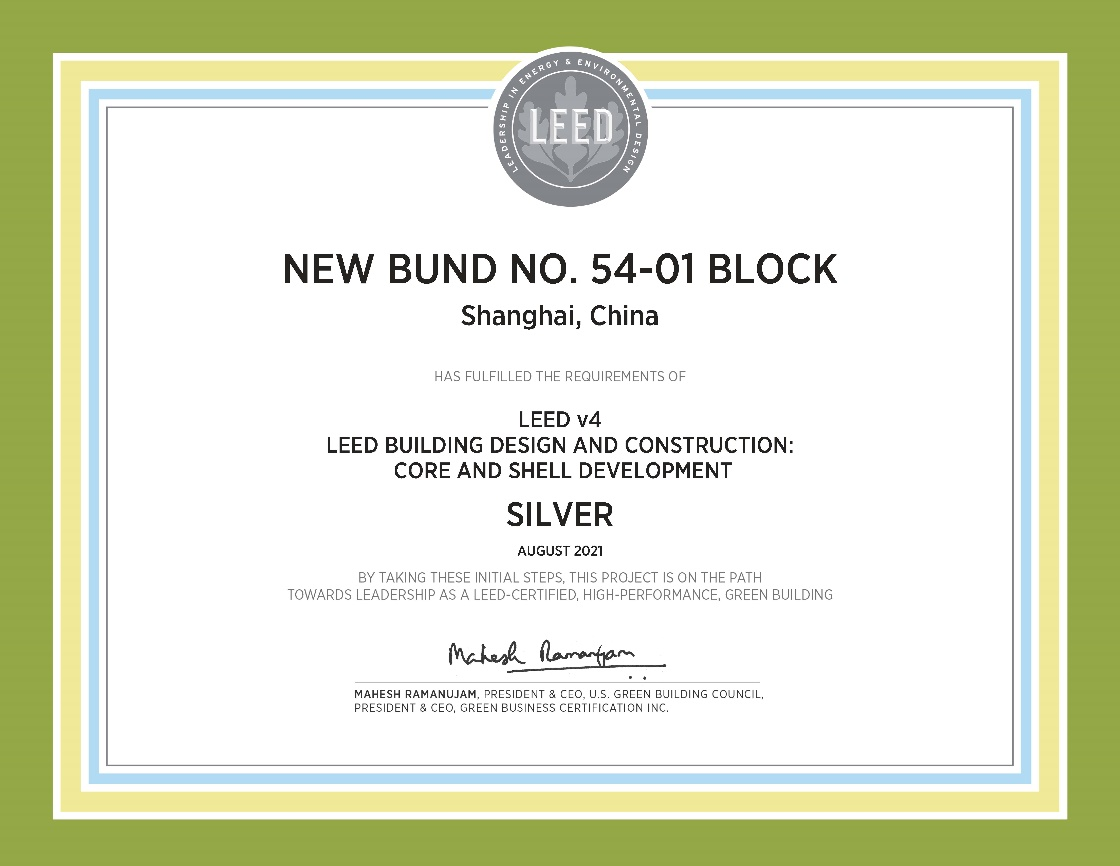 日前,由海誠股份所屬中國輕工業(yè)上海工程咨詢有限公司擔(dān)任綠建咨詢顧問的“前灘54-01地塊” 項(xiàng)目獲得LEED銀級(jí)預(yù)認(rèn)證。
