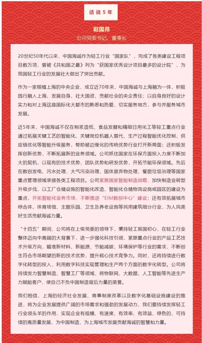 近年來(lái),中國(guó)海誠(chéng)積極倡導(dǎo)產(chǎn)學(xué)研合作,開(kāi)展技術(shù)創(chuàng)新。產(chǎn)學(xué)研合作成果已在多個(gè)項(xiàng)目的成套設(shè)備和工程體系中運(yùn)用,加速了中國(guó)海誠(chéng)科技能力的提升,也加快了市場(chǎng)開(kāi)拓的步伐。“作為從事輕工行業(yè)專業(yè)服務(wù)的在滬央企,中國(guó)海誠(chéng)將繼續(xù)堅(jiān)持在黨的領(lǐng)導(dǎo)下,肩負(fù)起全新的歷史使命,把握國(guó)際國(guó)內(nèi)發(fā)展大勢(shì),立足公司現(xiàn)實(shí),用組織變革、技術(shù)提升和數(shù)字化轉(zhuǎn)型跨越鴻溝,用創(chuàng)新進(jìn)取、服務(wù)客戶、精益管理、優(yōu)秀執(zhí)行來(lái)應(yīng)對(duì)不確定性,通過(guò)數(shù)字化轉(zhuǎn)型,站在更廣義的產(chǎn)業(yè)鏈上,再定位、再出發(fā),用數(shù)字技術(shù)和集成創(chuàng)新點(diǎn)亮海誠(chéng)未來(lái),以優(yōu)異的成績(jī)向黨的二十大獻(xiàn)禮!”中國(guó)海誠(chéng)黨委書(shū)記、董事長(zhǎng)趙國(guó)昂說(shuō)。