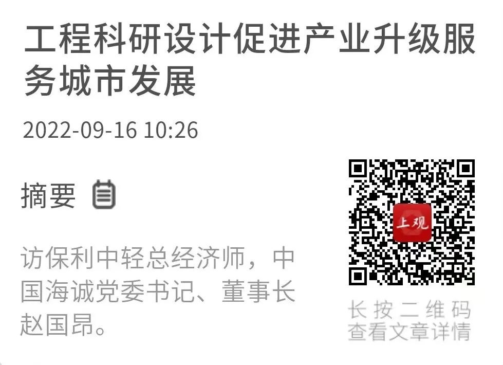 《工程科研設(shè)計促進產(chǎn)業(yè)升級服務(wù)城市發(fā)展——訪保利中輕總經(jīng)濟師,中國海誠黨委書記、董事長趙國昂》