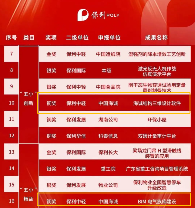 今年5月,保利集團組織開展了“五小”活動,歷經(jīng)7個月的組織報名、初審及專家評審,由中國海誠申報的“海誠結(jié)構(gòu)三維設(shè)計軟件”“BIM電氣族庫建設(shè)”從2000多份參賽作品中脫穎而出,分別榮獲“‘五小’創(chuàng)新”銅獎和“‘五小’精益”銅獎。