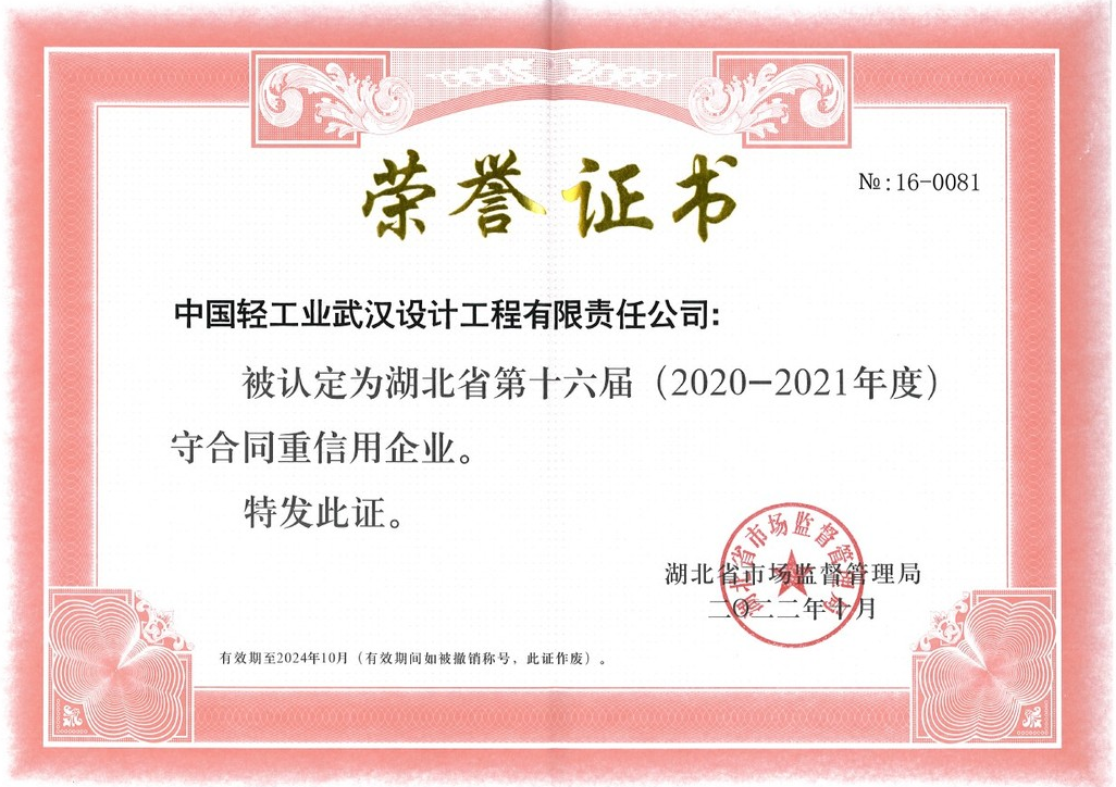 近期,在湖北省第十六屆(2020-2021年度)“守合同重信用”企業(yè)評選中,中國海誠武漢公司再次喜獲“守合同重信用”企業(yè)稱號。