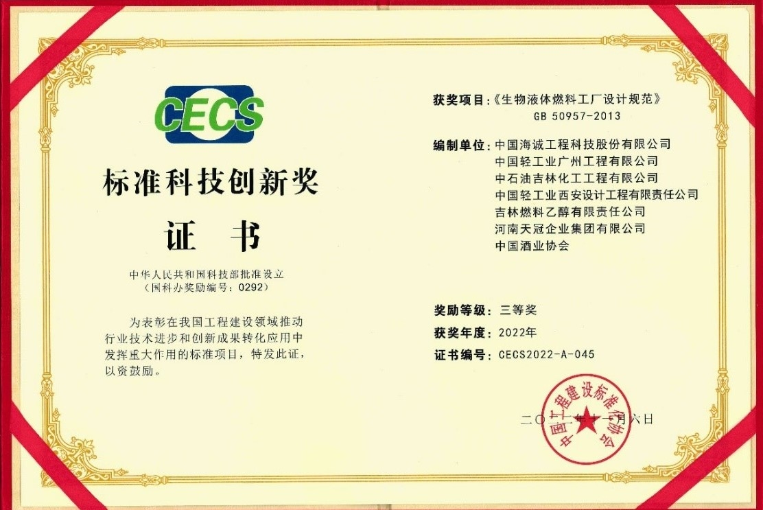 近期,2022年度標(biāo)準(zhǔn)科技創(chuàng)新獎頒獎典禮大會在京隆重舉行。經(jīng)過各方推薦申報、形式審查、專家初評、項目現(xiàn)場答辯、評審委員會投票和最終審定、結(jié)果公示等程序,中國海誠主編的《生物液體燃料工廠設(shè)計規(guī)范》(GB 50957-2013),榮獲“標(biāo)準(zhǔn)科技創(chuàng)新獎”項目獎三等獎。