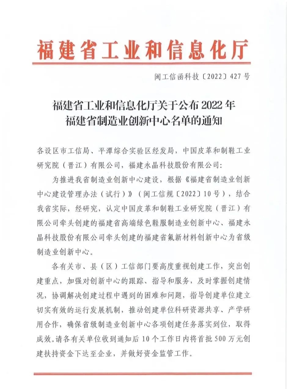 8月26日,福建省工業(yè)和信息化廳印發(fā)《福建省工業(yè)和信息化廳關(guān)于公布2022年福建省制造業(yè)創(chuàng)新中心名單的通知》,保利中輕所屬中國皮革制鞋研究院晉江公司榜上有名,牽頭創(chuàng)建運營的福建省高端綠色鞋服制造業(yè)創(chuàng)新中心(簡稱鞋服創(chuàng)新中心)被認定為福建省級制造業(yè)創(chuàng)新中心。