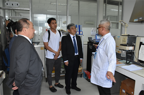 曹春昱一行首先來到柬埔寨國家科學(xué)技術(shù)創(chuàng)新實驗室(STINL),參觀水化學(xué)檢測室、重金屬元素分析室、果汁及啤酒中試車間等實驗室場所,詳細了解“一帶一路”聯(lián)合實驗室運行情況及此前中方援助設(shè)備使用情況。