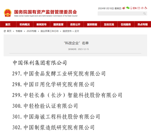 中國制漿造紙研究院新入圍國務院國資委“科改企業(yè)”名單,保利中輕科改企業(yè)增至6家。在國務院國資委年度專項考核中,中國食品發(fā)酵工業(yè)研究院、中輕檢驗被評為“標桿企業(yè)”,中國日用化學研究院、中輕長泰被評為“優(yōu)秀企業(yè)”。