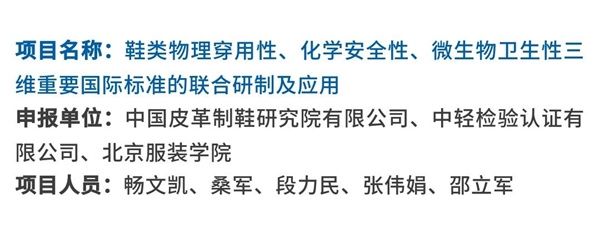中國皮革制鞋院聯(lián)合申報的“鞋類物理穿用性、化學安全性、微生物衛(wèi)生性三維重要國際標準的聯(lián)合研制及應用”項目,主導制定的國際標準ISO19574、ISO20535和ISO19577,打破多年來歐盟成員國技術(shù)壟斷,實現(xiàn)我國在鞋類微生物、物理和化學領(lǐng)域國際標準的突破,填補物理和化學檢測方法標準的國際空白。
