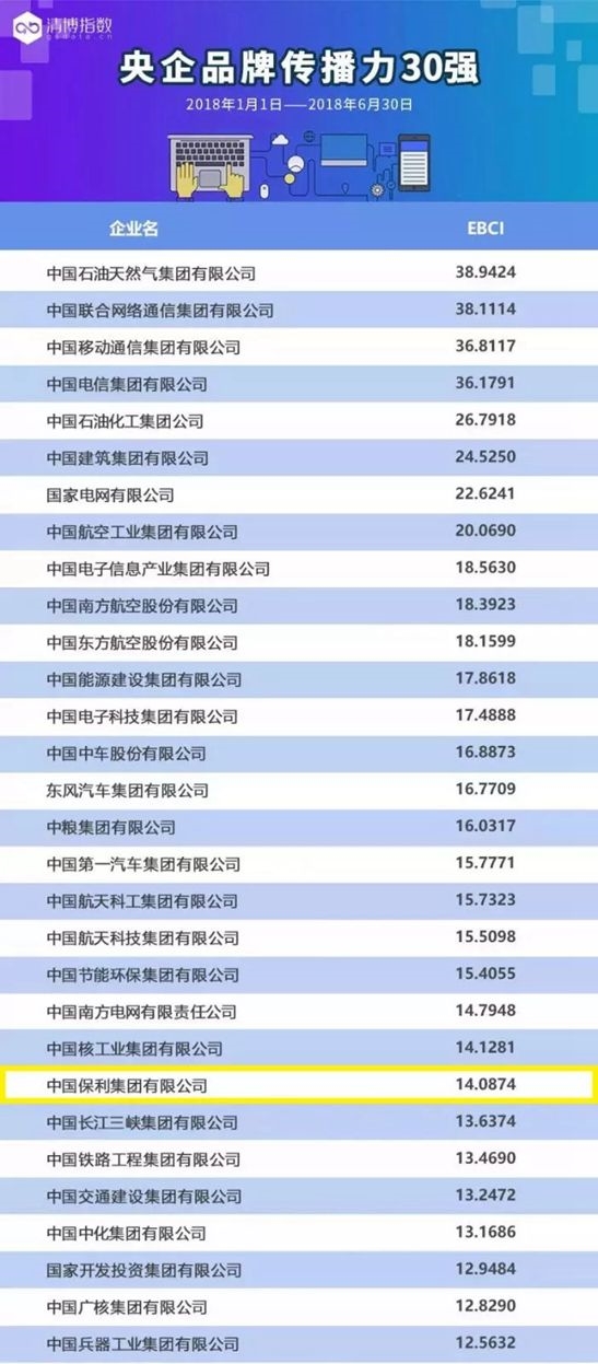 日前,2018上半年中央企業(yè)品牌傳播力榜單(簡(jiǎn)稱(chēng)“榜單”)新鮮出爐,保利集團(tuán)入圍三十強(qiáng),位列第23位。